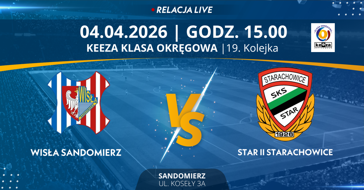 Witamy wszystkich kibiców oraz sympatyków piłki nożnej na meczu 19. Kolejki KEEZA Klasy Okręgowej. Dzisiaj Wisła Sandomierz podejmie kolejne domowe spotkanie, a ich rywalem będą rezerwy Staru Starachowice- wicelider tabeli. Prosto ze Stadionu Miejskiego w Sandomierzu kłania się nisko Mateusz Majdak |